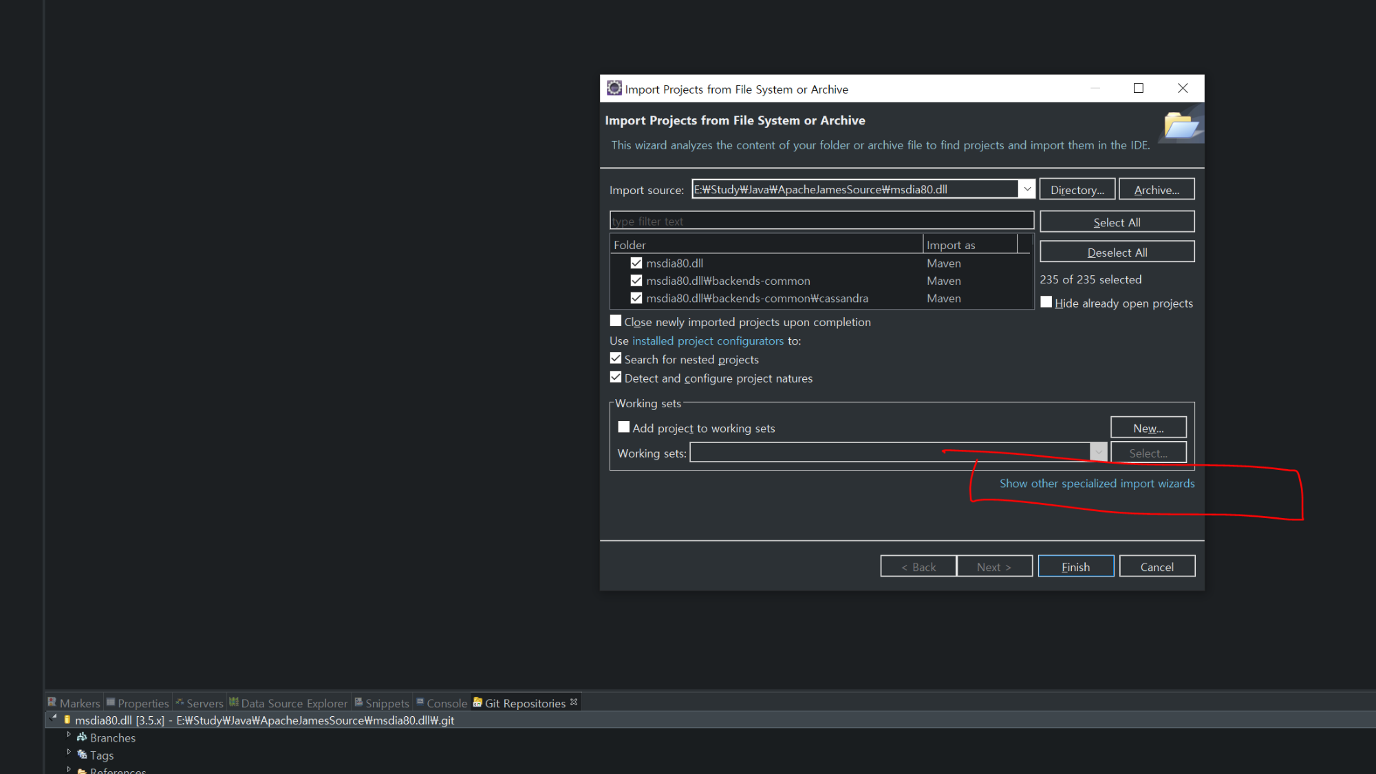 2. repository 우클릭 -> Import Project -> Show other specialized import wizards -> Existing Maven Projects