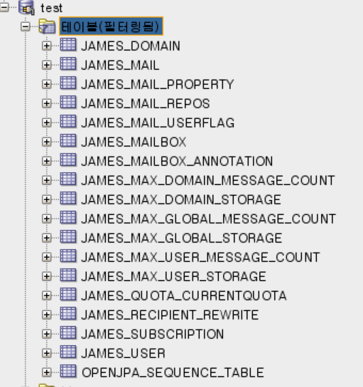 run에 성공할경우 다음과같이 테이블에 James 관련 테이블이 create됩니다.